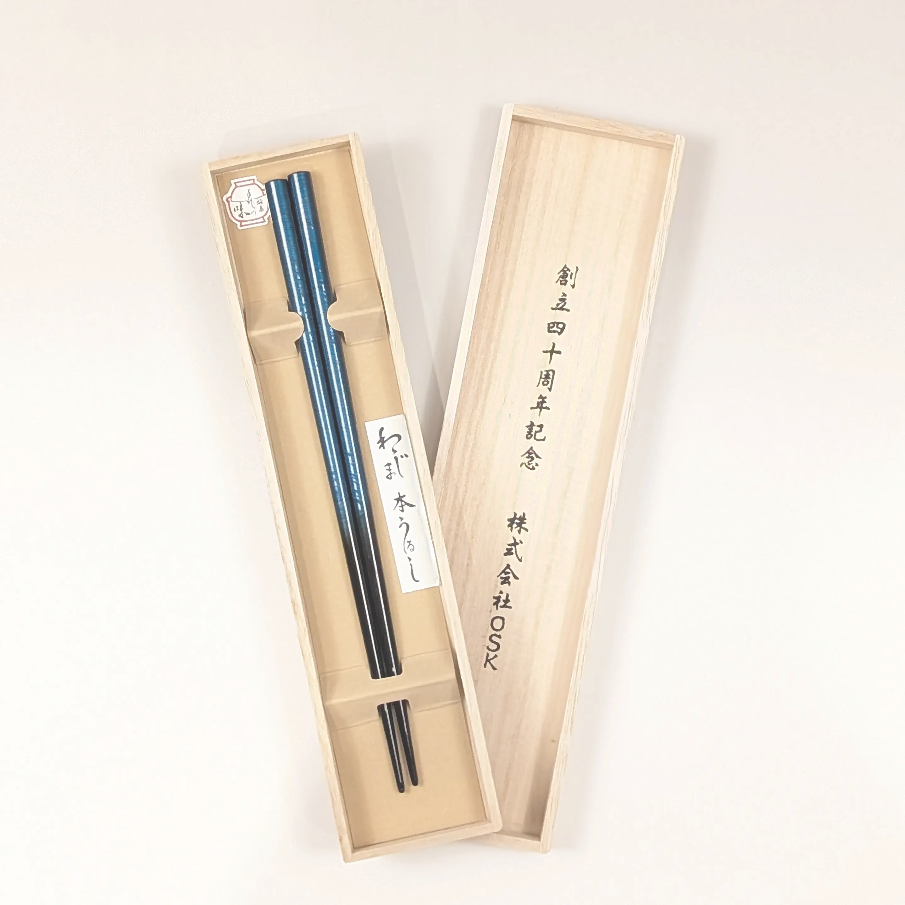 制作例の写真は伝統工芸士 中門博作 輪島塗のお箸で、木箱の裏に創立四十周年記念と会社名を印字しました。